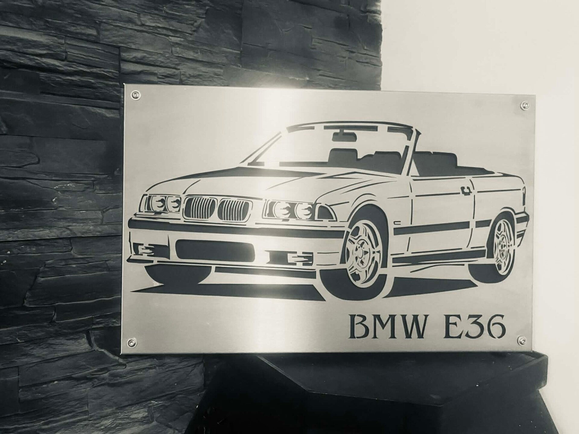 Stylowy obraz wykonany z wysokiej jakości metalu, przedstawiający kultowe BMW E36 Cabrio. Projekt został precyzyjnie wycięty laserowo, co gwarantuje doskonałe detale, ostre linie i nowoczesny wygląd.